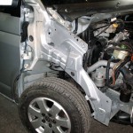 A new inner wing was fitted after jig work, and new panels fitted and aligned before painting.